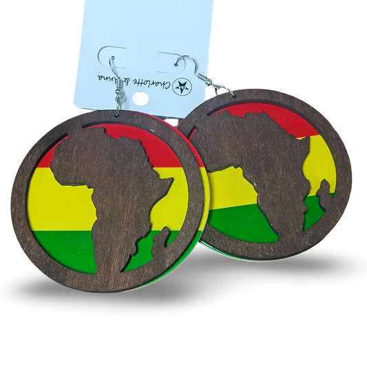 2 PIECE Red Yellow and Green Wooden earrings with Map of AFRICA - Rasta