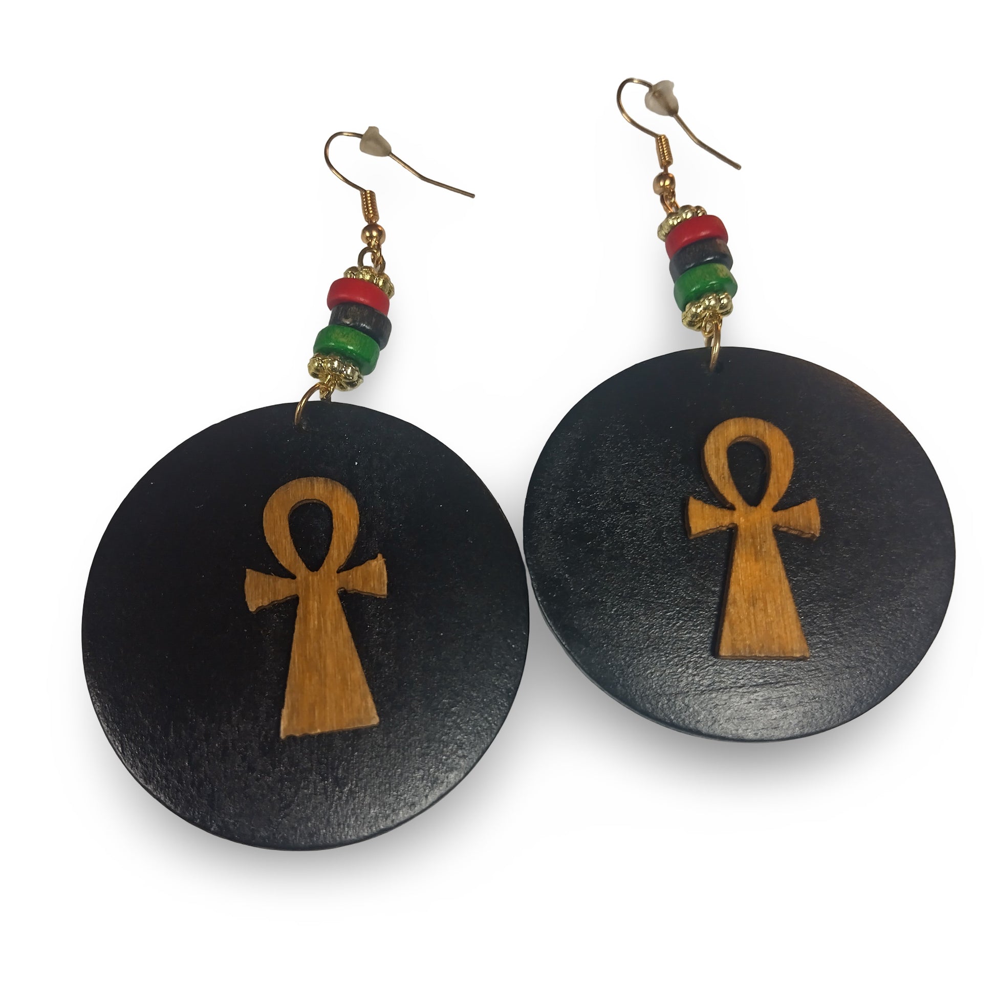Small Wood ANKH Earrings w/ Red Black and Green beads- Afrocentric Earrings - Black - Brown - Black