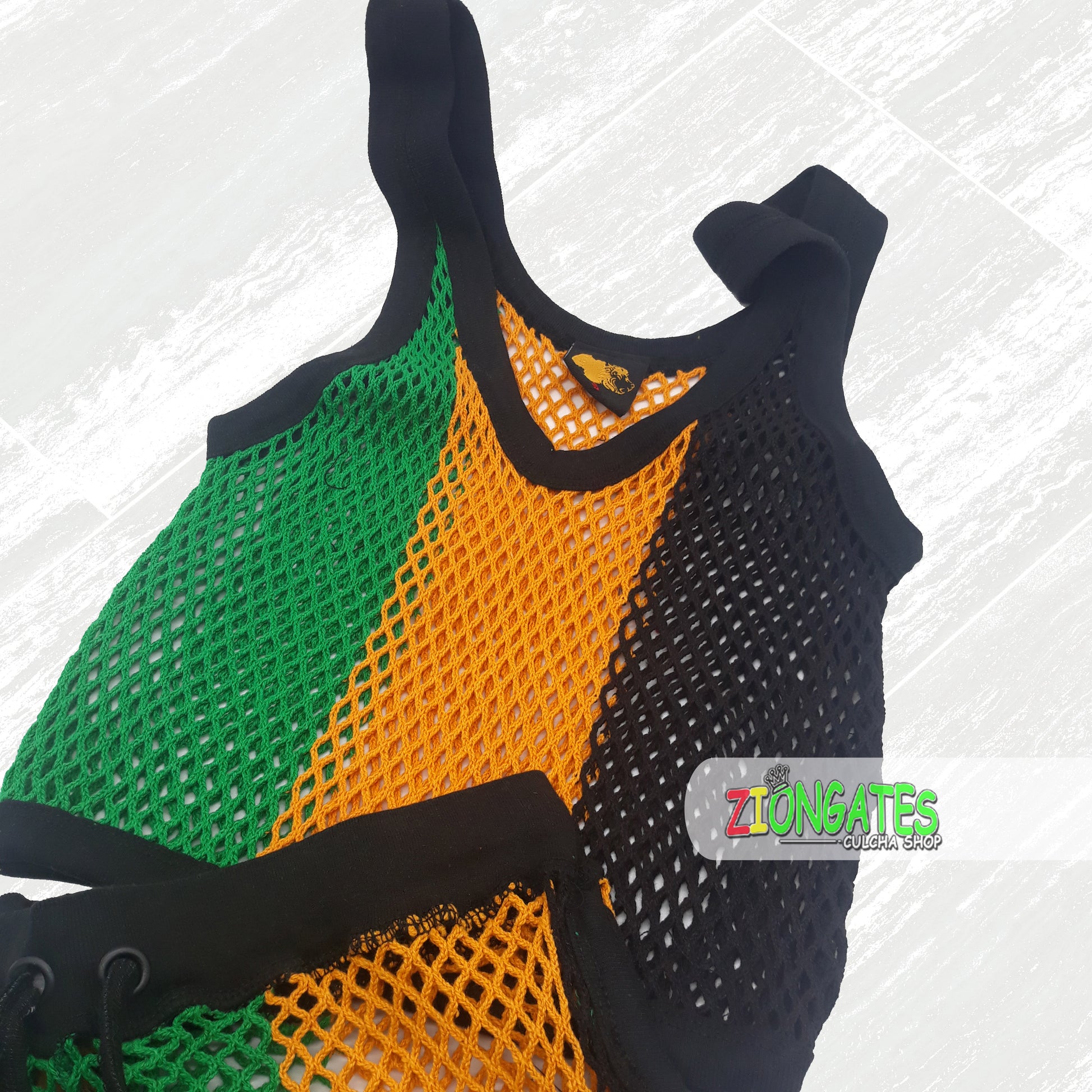 Experience vibrant Jamaican and Rasta colors in these Women's 2 piece Mesh Short sets, perfect for any beach, cruise, festival, or dancehall occasion.